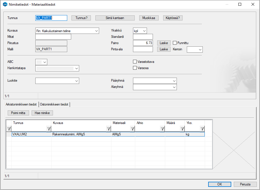 - Voit poimia osan mittoja materiaalitietojen kenttään Aihio.