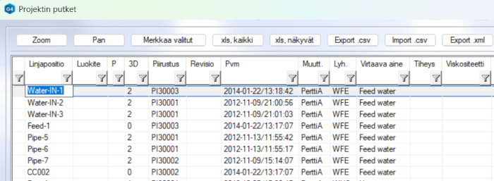 Avautuu valitun tyypin mukainen listanäyttö. Tässä esimerkkinä Projektin putket -luettelo.