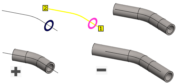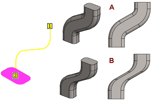 - Määrittää pyyhkäisypiirteen ensimmäisen pään trimmauksen joko mallista valittavaan elementtiin tai estää trimmauksen. Päät havainnollistetaan mallissa numeroin 1 ja 2. Valitse jokin seuraavista: