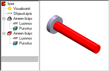 Kuva 1: Valmis työkalu. Piirresymbolin punainen väri kertoo piirteen olevan työstävä piirre. Mallissa työstävä piirre esitetään myös punaisella värillä. - Lisää työkalu kokoonpanoon valitsemalla tilannekohtainen toiminto .