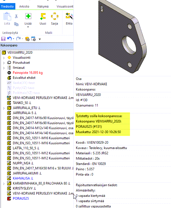 Työstetyn osan tippitekstissä kerrotaan millä kokoonpanotasolla ja millä osilla osaa on työstetty.