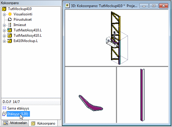 Kokoonpanon geometriset ehdot näkyvät kokoonpanopuun alaosassa. Kun valitset osan kokoonpanopuusta, ainoastaan siihen liittyvät ehdot näytetään puun alla. Jos valitset kokoonpanon tunnuksen, kaikki geometriaehdot esitetään luettelossa.