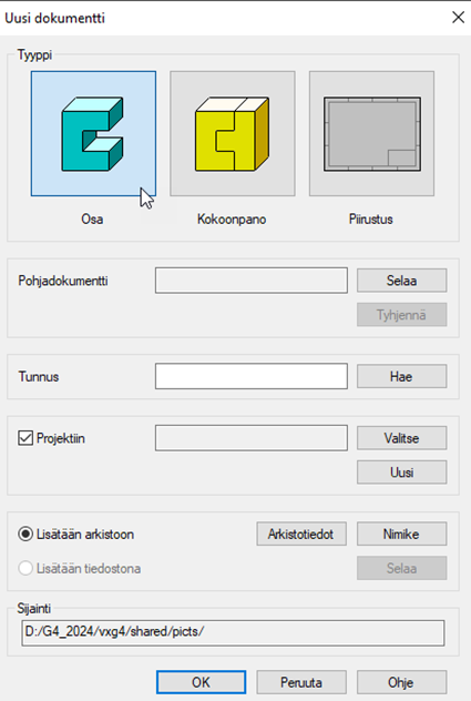 • If you want to create a new part as a file, clear the option To project, and select Add to file. Select the file's location by clicking Browse.