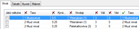 - Saman elementtityypin elementit, joilla on keskenään erilaiset ominaisuudet, esitetään luettelona riveittäin otsikoiden alapuolella.