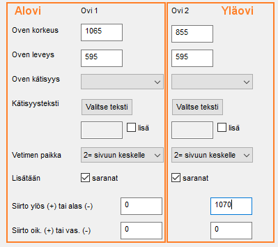 • Anna molempien ovien Ovi 1 ja Ovi 2 ominaisuuksissa Oven leveys -kenttiin lukuarvot.