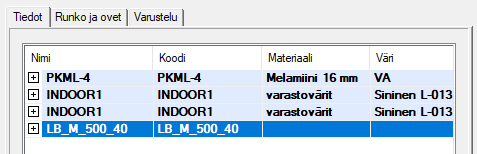 - Valitse Kalusteen muokkaus -keskusteluikkunassa sivu Tiedot. Kalusteen rakenneosat esitetään luettelossa.