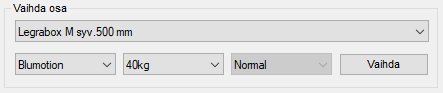 - Napsauta luettelosta aktiiviseksi laatikko, jonka haluat vaihtaa, esimerkiksi LB_M_500_40 (Legrabox M, syv. 500 mm, kantavuus 40 kg).
