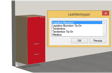 - Laatikkovaihtoehtoina löytyvät Blum Oy:n Legrabox, Tandembox ja Metabox laatikot variaatioineen.