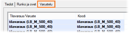 - Valitse luettelosta Tilavaraus/Varuste-rivi, jolle lisäät varusteen.