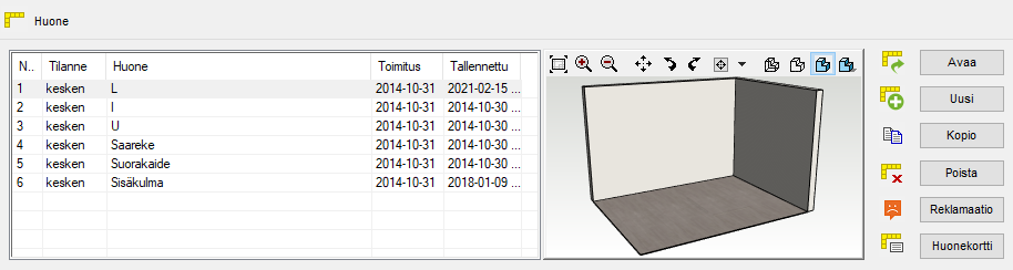Sen jälkeen kun olet avannut projektin, voit avata projektiin kuuluvan vanhan huoneen. Vain yksi huone voi olla kerrallaan avoimena. Kun huone avataan, ohjelma muistaa huoneen edelliseltä tallennuskerralta aktiivisena olleen seinän sekä viimeisen katselusuunnan.