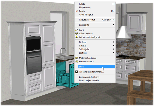 Esimerkki: Valitse ensin kaappi (etulevy auki). Valitse tilannekohtainen toiminto Sulje.