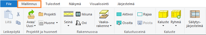 Aloitusvälilehti on Mallinnus, joka sisältää pääasiassa objektien lisäykseen liittyviä toimintoja.