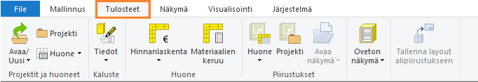 Osaluetteloihin, hintoihin, piirustuksiin ja muihin mallista tuotettuihin dokumentteihin liittyvät toiminnot löytyvät Tulosteet-välilehdeltä. Välilehdeltä löytyvät myös toiminnot katselupisteiden määrittämiseen sekä visualisoidun kuvan tallentamiseen.