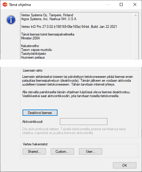 Jos käytössä on NetVID -lisenssi, voi siirtää lisenssin toiseen tietokoneeseen napsauttamalla Deaktivoi lisenssi. Ota aktivointikoodi talteen, käynnistä ohjelma toisella tietokoneella ja anna aktivointikoodi.