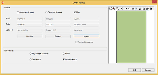Keskustelukkunassa voit valita uuden ovimallin. Samalla voit valita mihin kalusteisiin vaihto kohdistuu.