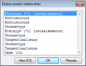 Piirustukseen lisätyt geometriaehdot esitetään luettelossa. Ratkaisematon ehto havainnollistetaan luettelossa.
