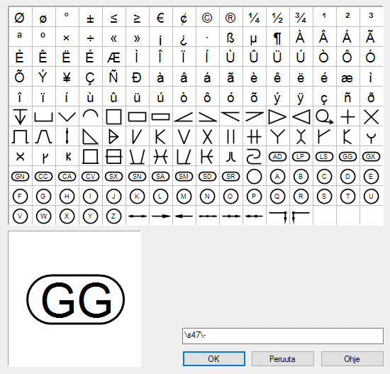 - Vie kohdistin merkkivalikoimassa halutun merkin kohdalle. Merkki havainnollistetaan suuremmassa koossa ikkunan kehyksessä.