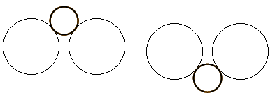 Esimerkki: Keskipisteen puoli on osoitettu tangeeraavien ympyröiden keskipisteiden välisen janan yläpuolelta (vasen kuva) ja alapuolelta (oikea kuva).