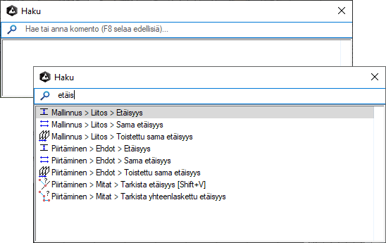- Kirjoita toiminnon tai komennon nimessä esiintyvä merkkijono Haku-ikkunaan.