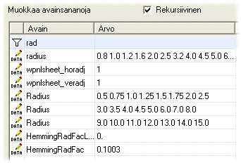 Esimerkissä etsit avainsanan radius koko avainsanajoukosta. Avainsana määrittää vaihtoehdot luetteloon, josta voit valita kahden viivan välisen pyöristyksen säteen. Kun etsit avainsanaa koko avainsanajoukosta, voit saada haun tuloksena useita samannimisiä avainsanoja. Voit päätellä oikean avainsanan selvittämällä kunkin avainsanan avainsanaryhmän ja ryhmän kuvaustekstin.