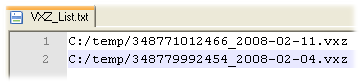 - Listatiedostoon List_2.txt ei pidä tallentaa sellaista VXZ-tiedostoa, joka on muodostettu samasta kohteesta aikaisemmin kuin listatiedostossa List_1.txt esiintyvä VXZ-tiedosto.
