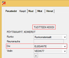 Kaappien tiedoissa voit määrittää materiaali- ja väriominaisuuksia pöytäkaapille/komerolle sekä seinäkaapille. Kaapin rakenneosille, kuten reunanauhalle, ovelle ja vetimelle voit myös tehdä valintoja. Lisäksi voit valita kaapille laatikkotyypin, saranatyypin sekä sokkelijalat.