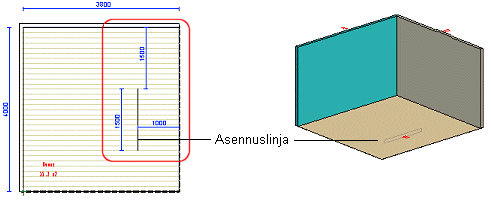 Lisää asennuslinja 2D-piirustuksessa ja paikoita asennuslinja geometriaehdoilla. Asennuslinja näkyy huoneen seinien luettelossa yhtenä seinä, kun lisäät kalusteita huoneen 3D-malliin.