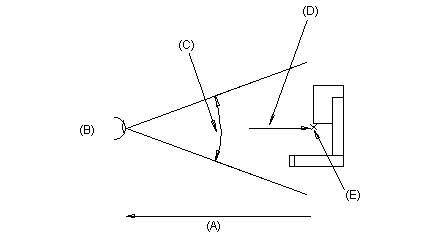Katselusuunnan lisäksi perspektiiviselle projektiolle voidaan määrittää katseluetäisyys ja näkökulma. Katseluetäisyys (A) määrittää katselupisteen (B) paikan. Näkökulman (C) oletusarvo on 75 astetta. Näkökulma avautuu katselupisteestä katselusuuntaan (D) päin. Mallin keskipiste on (E).