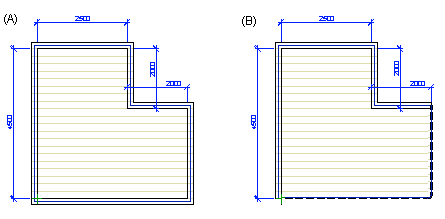 • Seinäviiva on piirretty avoimena. Seinäviiva täydentyy automaattisesti tilanjakoseinäviivalla (B). Seinäketju on suljettu.