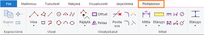 Viivat, mitat, tekstit ja kuviot löytyvät Piirtäminen-välilehdeltä, kun 2D-piirustus on aktiivinen.