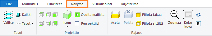 Näkymä-välilehdeltä löytyvät piirustuksen ja mallin tarkasteluun liittyvät toiminnot sekä ikkunoiden hallinnan toiminnot.