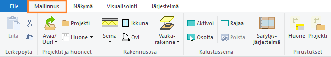Aloitusvälilehti on Mallinnus, joka sisältää pääasiassa objektien lisäykseen liittyviä toimintoja.