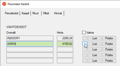 • Toiminto huomioi hinnan laskennassa kalusteet ja kalusteiden osat, jotka on toiminnolla Tuote tilaukseen/Ei valittu pois laskennasta.