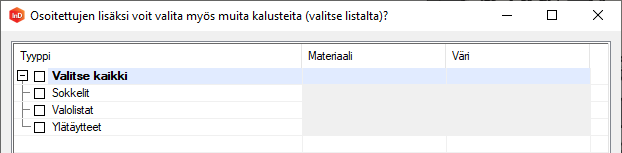 - Jos et tee mitään valintaa, uusi materiaali/väri vaihdetaan kaikkiin kyseisen kalustetyypin kalusteisiin.