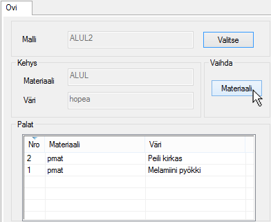 Voit vaihtaa oville aikaisemmin määriteltyjä materiaaleja. Näet materiaalit Liukuovikaluste-keskusteluikkunan Tarvikkeet ja ovet - välilehdellä.