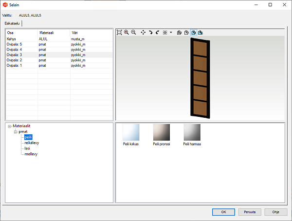 - Näytölle avautuu selain, josta voit valita materiaalit oven osille.