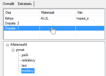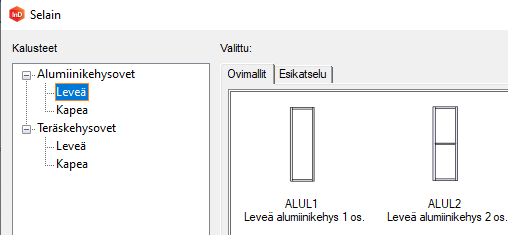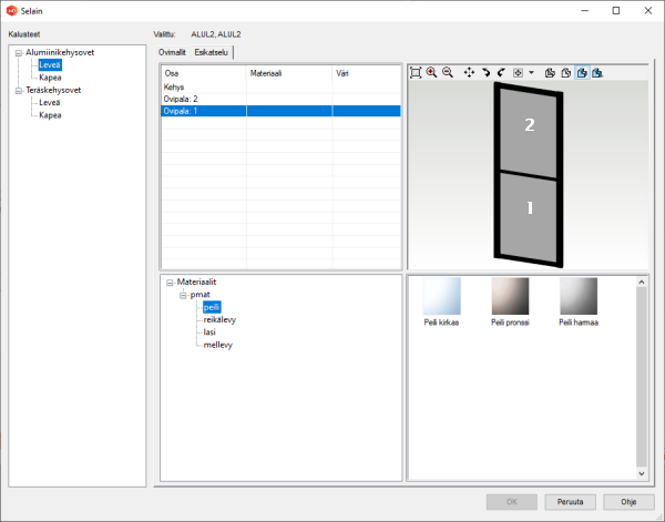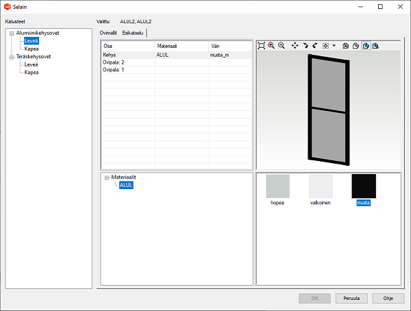 - Voit vaihtaa kehyksen ja ovipalojen materiaaleja napsauttamalla Valitse.
