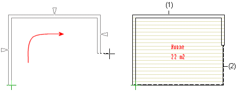 Esimerkkikuvassa on seinäviiva piirretty avoimena (1), joka täydentyy automaattisesti suljetuksi tilanjakoseinäviivalla (2).