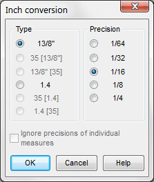 - Dimension-specific inch conversion precisions are not taken into consideration when this checkbox is selected. If the checkbox is empty, dimension-specific conversion precisions are kept. This function is available when you are converting the existing dimensions in a drawing into inches by using the function