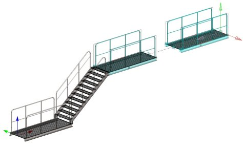 - Platforms and stairs can also be edited like normal assemblies. For example, platforms with railings and edge profiles can be trimmed to connect and be resolved, and railings can be added and removed.