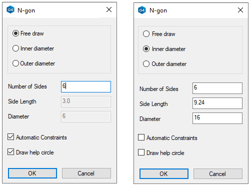 - You can sketch the polygon freely, or you can define the size of the polygon based on the size of the circle that fits inside (=width across the flat) or the size of the circle passing through the corners of the polygon.