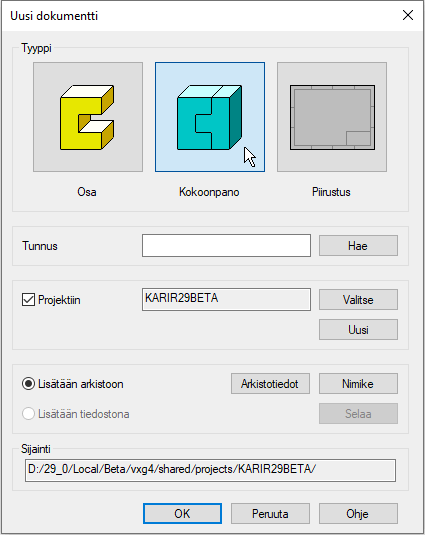 Lisätään arkistoon. - Oletuksena uusi kokoonpano tallentuu samaan projektiin, jossa pääkokoonpano on.
