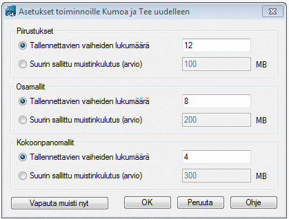 Säädä muistiin tallennettavien piirustus-/mallikohtaisten vaiheiden maksimilukumäärän.
