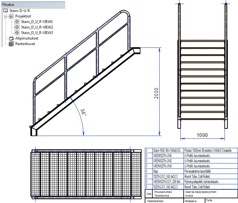 - Reitityksessä lisää portaat Nuoli ylös tai Nuoli alas -näppäimellä. Portaat on tallennettu kirjastoon nousukulman perusteella, 38 astetta, esimerkkinä. Oletuksena portaat lisätään mitat kiinnitettynä.