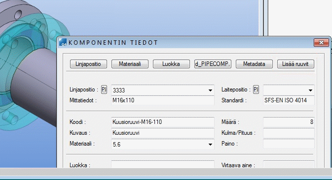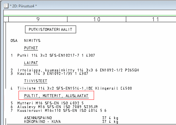 Toiminnolla Lisää ruuvit lisätyt osat ohjautuvat automaattisesti PULTIT, MUTTERIT, ALUSLAATAT -otsikon alapuolelle Isometrikuvien osaluettelossa.