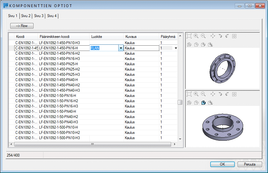 2. Valitse luokite KOMPONENTTIEN OPTIOT -tietokannassa. Esimerkkinä, luokite FLAN. Valitse OK.