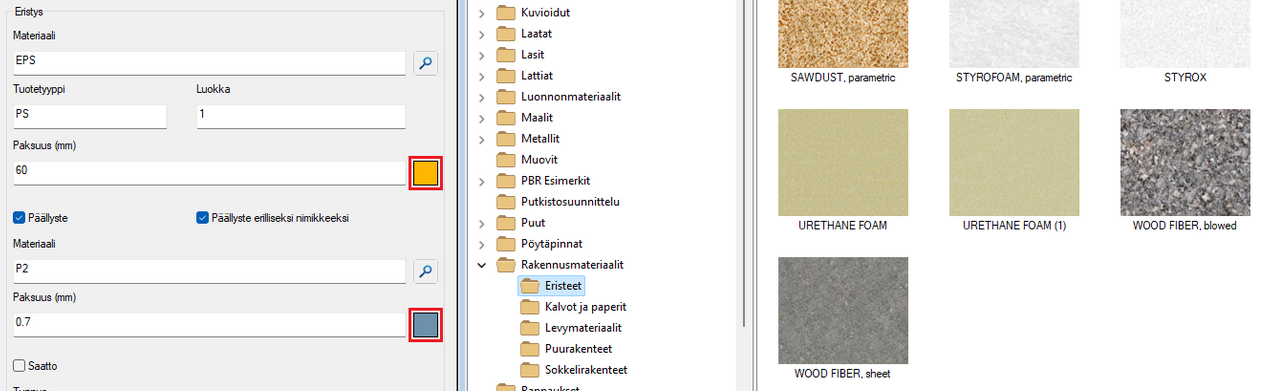 Värin valinta eristeelle ja eristeen päällysteelle noudattaa samaa periaatetta kuin yleinen värin valinta osille. Värin valinta vanhasta VxColor-paletista ei ole enää mahdollista.