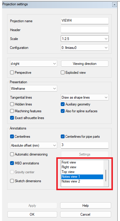 - Tässä dialogissa määritellään projektion perusasetukset sekä 2D-vientiin sisällytettävät annotaatiot. Dialogin avulla voidaan hallita näkymän suuntaa, esitystapaa, mittakaavaa sekä MBD-annotaatioiden ja screen space -annotaatioiden vientiä.