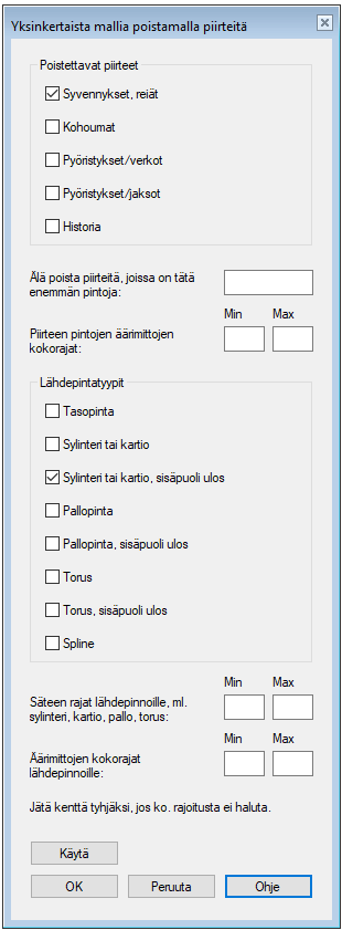 - Tällä valinnalla voit poistaa piirteitä, jotka koostuvat sylinteri-, kartio-, pallo- tai toruspinnoista ja joiden minimikoko on määrätty.
