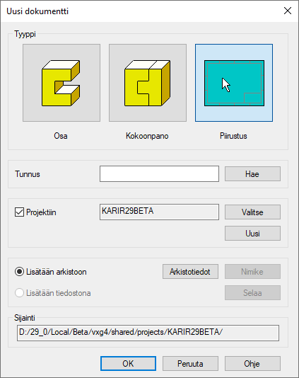 - Mallin piirustus tallentuu oletuksena myös piirustusarkistoon.
